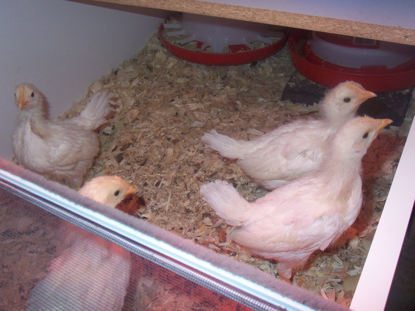 We were certain that the larger ones would scare the new babes to death, it turned out to be the other way around. As soon as the bigger ones saw the little ones they started trying to get away from them. It was really funny! We have them in two very large box type brooders next to each other. They can’t see each other, because the sides are solid, but they stand and chirp at each other all day.