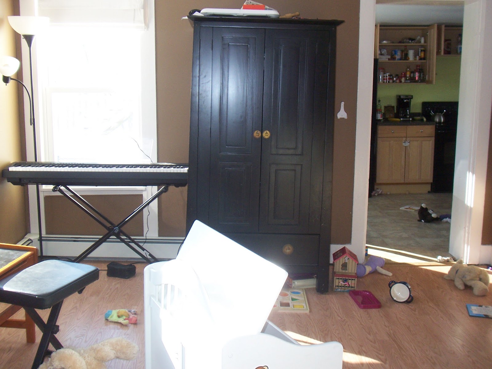 Everything fits! We have the one box with all the blocks/legos/large lacing beads. The pink suitcase was mine when I was Emma’s age, and it holds all of my old my little ponies and accessories. And then there are the stuffed animals/friends/all of my wristlet purses that Emma has claimed as her own. While things still get quite unruly when everything comes out of the toy box, it seems pretty easy to clean up now. And as soon as I had taken that picture of the kids’ kitchen, Jack came out and dumped the whole basket all over the floor…clean for literally 30 seconds π I guess that is the life with littles!