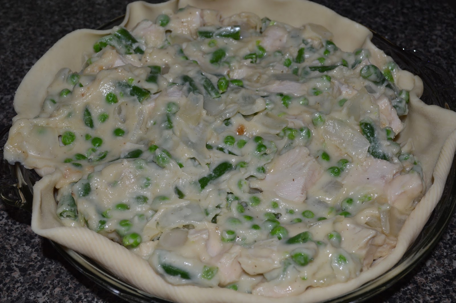 Last week I was looking for an easy meal, and remembered that I still had the turkey breast in the freezer, so I decided to make a turkey pot pie. This was one altered by my kids. They asked for green beans and peas to be the vegetables, so that is all that is in there, you could easily decrease the frozen veggies and put in a potato if you want!