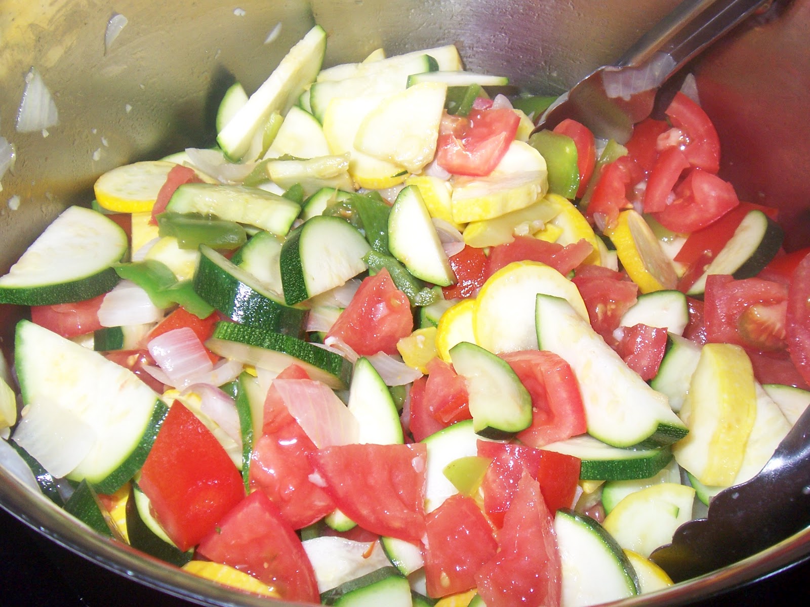 This is my “summer fresh tomato sauce.” And typically gets eaten plain by me, but on pasta for everyone else. Super simple, just saute garlic, onions, peppers, zucchini and summer squash, then add chopped tomatoes and let cook down a bit. Salt, pepper, and red pepper flakes are my main seasonings. There was a time that I would put parmasan cheese or mozzarella on it, not as much anymore unfortunately 🙂 It tastes so fresh, and with all those veggies, is very filling.